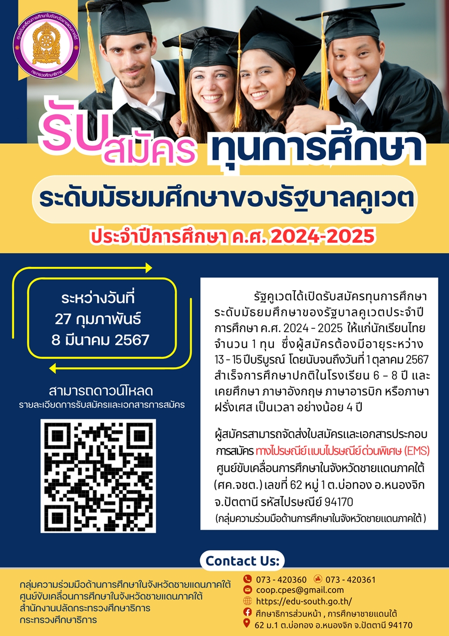 ทั้งนี้ ดาวน์โหลดรายละเอียดการรับสมัคร และเอกสารการสมัครได้ที่ https://me-qr.com/0POquO3Q หรือทางเว็บไซต์ ศค.จชต. https://edu-south.go.th/news-028-67/