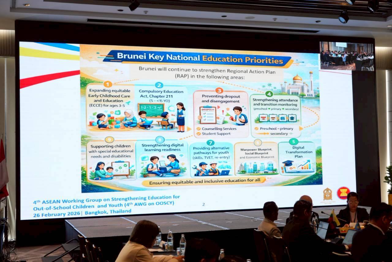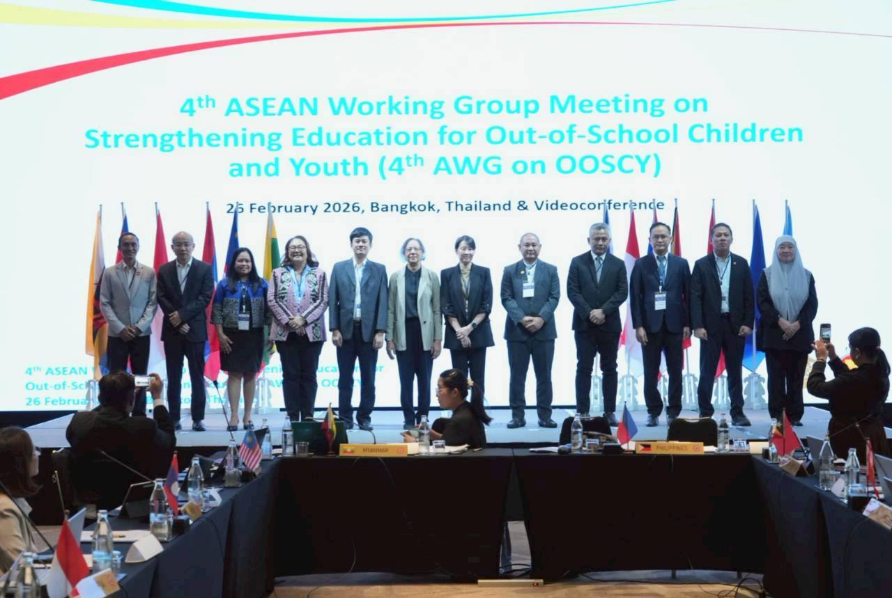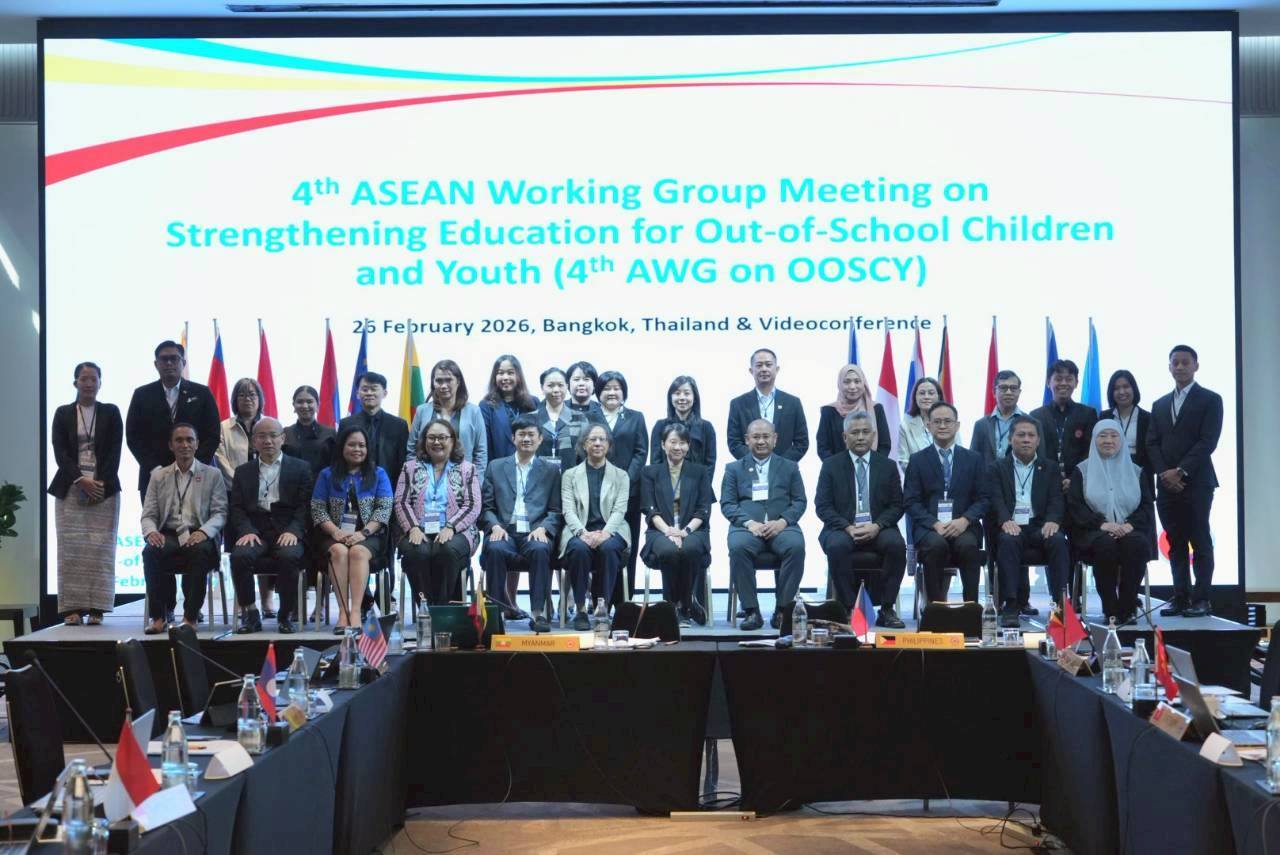 26 กุมภาพันธ์ 2569 / สำนักงานปลัดกระทรวงศึกษาธิการ โดย นางสาวดุริยา อมตวิวัฒน์ ในฐานะที่ปรึกษาพิเศษด้านความร่วมมือกับต่างประเทศของสำนักงานปลัดกระทรวงศึกษาธิการ เป็นประธานประชุมคณะทำงานเพื่อเสริมสร้างความเข้มแข็งด้านการศึกษาให้แก่เด็กและเยาวชนที่ตกหล่น ครั้งที่ 4 (4th Meeting of the ASEAN Working Group on Strengthening Education for Out-of-School Children and Youth: OOSCY) ณ โรงแรม สกายวิว สุขุมวิท 24 กรุงเทพฯ