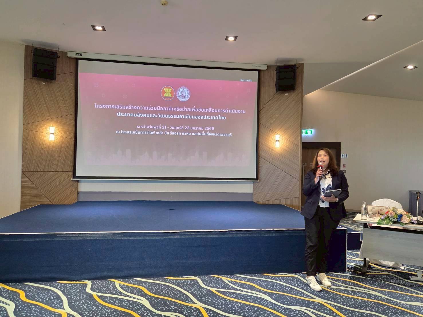 เมื่อวันที่ 21-23 มกราคม 2569 กระทรวงศึกษาธิการได้มอบหมายให้ นางสาวพิชญสุดา พลเสน และ นางสาวกนกวรรณ แกว่นถิ่นภู นักวิเทศสัมพันธ์ชำนาญการ กลุ่มความร่วมมือระดับภูมิภาค สำนักความสัมพันธ์ต่างประเทศ สำนักงานปลัดกระทรวงศึกษาธิการ เข้าร่วม โครงการเสริมสร้างความร่วมมือภาคีเครือข่ายเพื่อขับเคลื่อนการดำเนินงานประชาคมสังคมและวัฒนธรรมอาเซียนของประเทศไทย ณ โรงแรมเซ็นทารา ไลฟ์ ชะอำ บีช รีสอร์ท หัวหิน จังหวัดเพชรบุรี