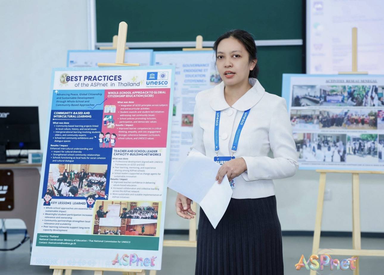 ในโอกาสนี้ ผู้แทนสำนักเลขาธิการคณะกรรมการแห่งชาติว่าด้วยยูเนสโก ได้นำเสนอการดำเนินงานในส่วนของประเทศไทย ได้แก่ 1) Poster Session โดยผู้แทนสำนักเลขาธิการคณะกรรมการแห่งชาติฯ ในฐานะ ASPnet Coordinator ได้นำเสนอแนวปฏิบัติที่ดี หัวข้อ Advancing Peace, Global Citizenship and Sustainable Development through Whole-School and Community-Based Approaches เน้นการอบรมครูในเครือข่าย ASPnet ประเทศไทยให้ตระหนักถึงแนวคิดสำคัญด้านสันติภาพ ความเป็นพลเมืองโลก และเป้าหมาย SDG 4 ผ่านทักษะการถ่ายทอดการเรียนการสอนแบบการพัฒนาโรงเรียนทั้งระบบ และการเรียนรู้โดยใช้ชุมชนเป็นฐาน โดยแต่ละปีจะมีการจัดประชุมอบรมสัมมนาครูและนักเรียนเพื่อให้ความรู้ แลกเปลี่ยนประสบการณ์ รวมถึงกิจกรรมเพื่อพัฒนาศักยภาพของผู้เรียนผู้สอนอย่างต่อเนื่อง และ 2) Peer-to-Peer Session ในส่วนของประเทศไทยเป็นการนำเสนอร่วมกันระหว่างผู้แทนสำนักงานยูเนสโก กรุงเทพ และผู้แทนสำนักเลขาธิการคณะกรรมการแห่งชาติฯ ภายใต้โครงการ Sustaining our Ocean วัตถุประสงค์เพื่อสร้างความตระหนักแก่เยาวชนในการรักษาและเห็นคุณค่าทรัพยากรทางทะเลผ่านสื่อการเรียนดิจิทัล โครงการได้รับการสนับสนุนจากหลายภาคส่วน เริ่มปฏิบัติการนำร่องที่จังหวัดระนองซึ่งเชื่อมโยงกับพื้นที่สงวนชีวมณฑลระนอง (Ranong Biosphere Reserve) โดยโครงการระยะต่อไปจะขยายผลไปยังโรงเรียนทุกสังกัดทั่วประเทศ