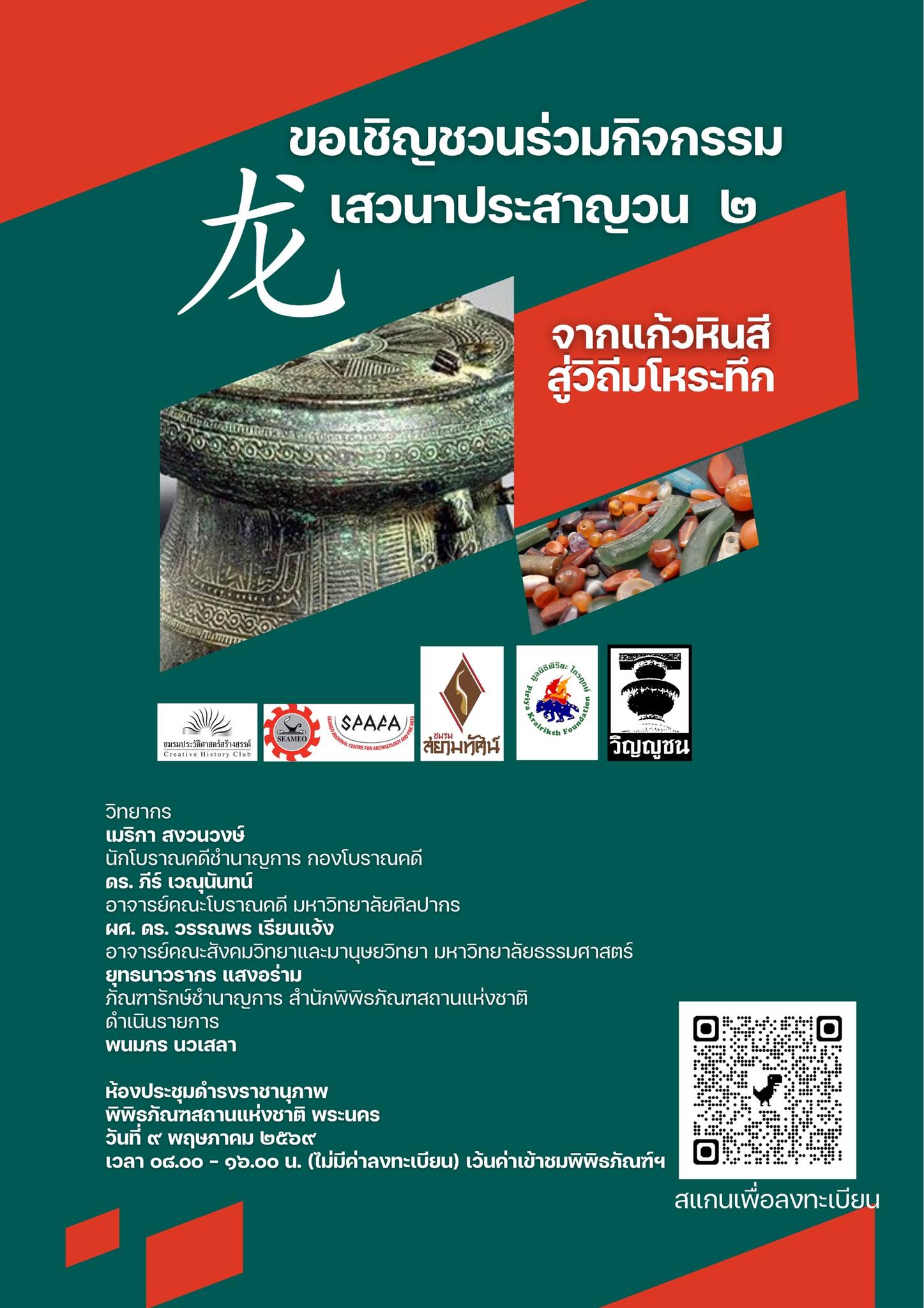 ศูนย์ระดับภูมิภาคว่าด้วยโบราณคดีและวิจิตรศิลป์ของซีมีโอ (SEAMEO Regional Centre for Archaeology and Fine Arts: SEAMEO SPAFA – ซีมีโอสปาฟา) ร่วมกับชมรมประวัติศาสตร์สร้างสรรค์ ขอเชิญผู้สนใจเข้ารร่วมงานเสวนาเชิงวิชาการ หัวข้อ “เสวนาประสาญวณ 2 : จากแก้ว หินสี สู่วิถีมโหระทึก” ซึ่งมีวัตถุประสงค์เพื่อส่งเสริมการแลกเปลี่ยนและเผยแพร่ความรู้ด้านประวัติศาสตร์และวัฒนธรรม ตลอดจนสร้างความตระหนักถึงรากฐานทางวัฒนธรรมที่มีความสัมพันธ์อันดีมาอย่างยาวนานระหว่างประเทศไทยและสาธารณรัฐสังคมนิยมเวียดนาม